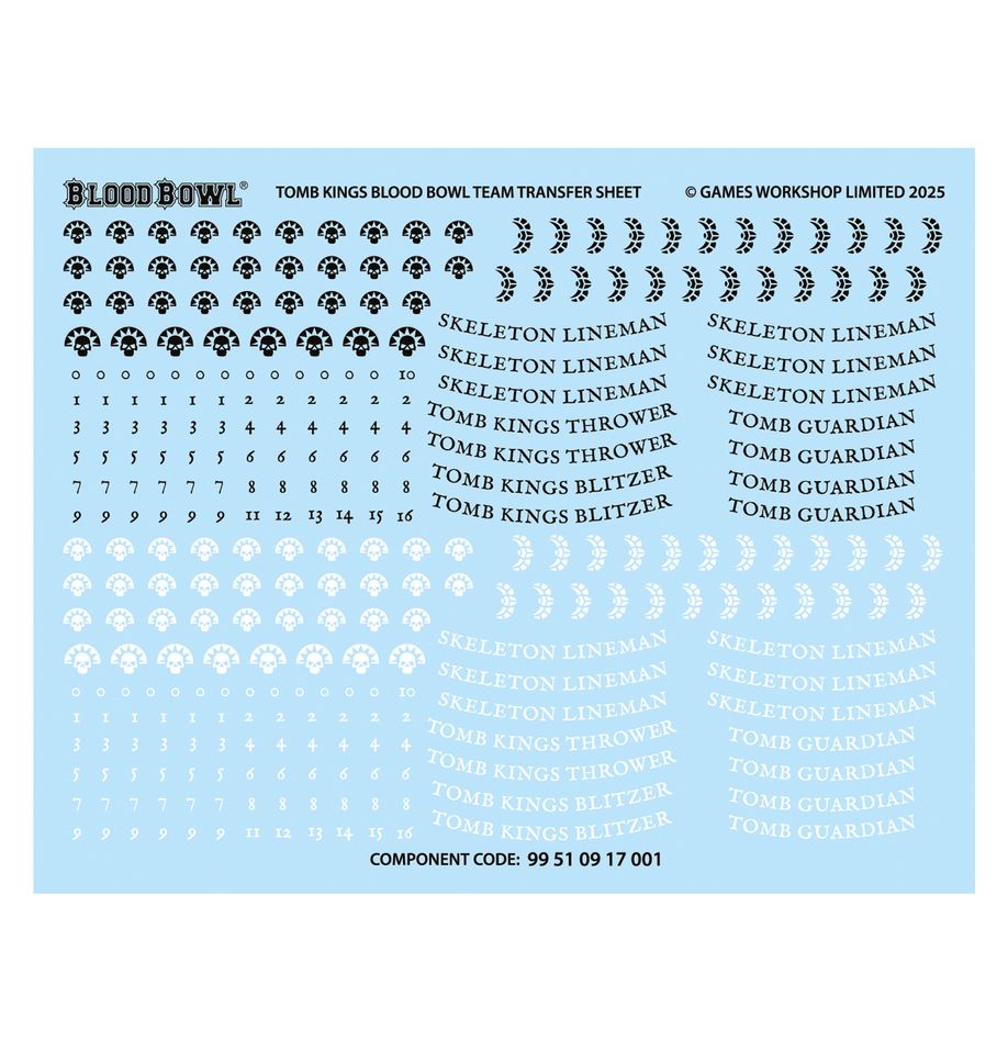 Il kit è fornito con un foglio di trasferibili del team Tomb Kings di Blood Bowl, contenente 298 decalcomanie ad acqua di alta qualità.