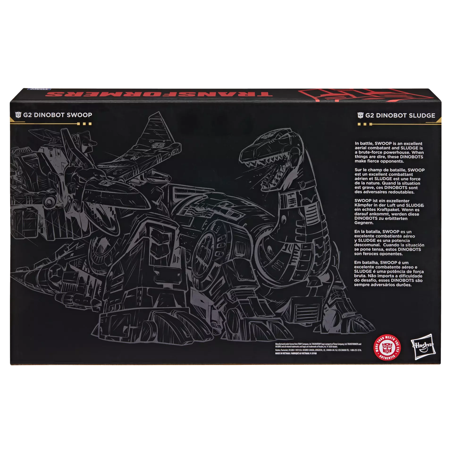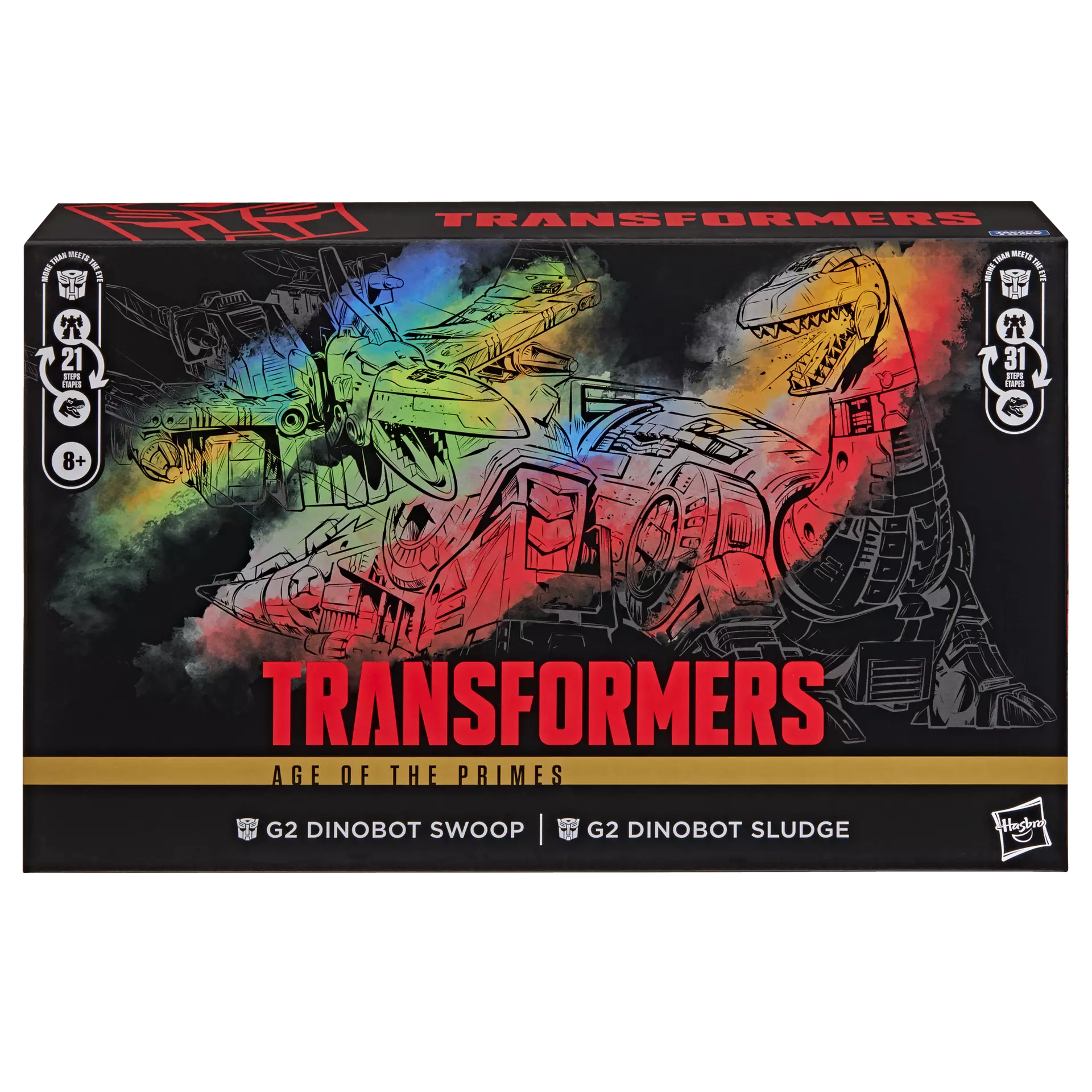 Questa confezione include l'action figure Leader Class di Dinobot Swoop G2 che si converte tra le modalità robot e pteranodonte in 21 passaggi e l'action figure Leader Class di Dinobot Sludge G2 che si converte tra le modalità robot e brontosauro in 31 passaggi.