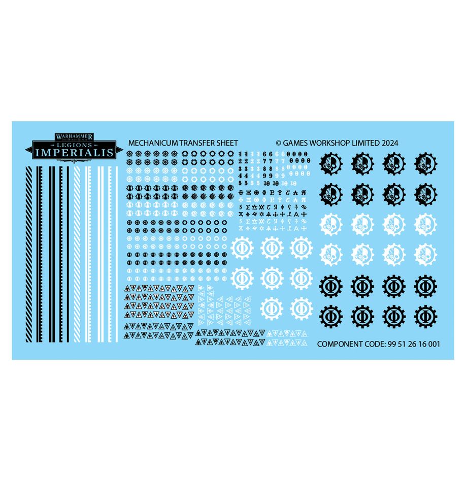 Il kit include inoltre 2x fogli di trasferibili del Mechanicum, ciascuno contenente 500 decalcomanie ad acqua di alta qualità.
