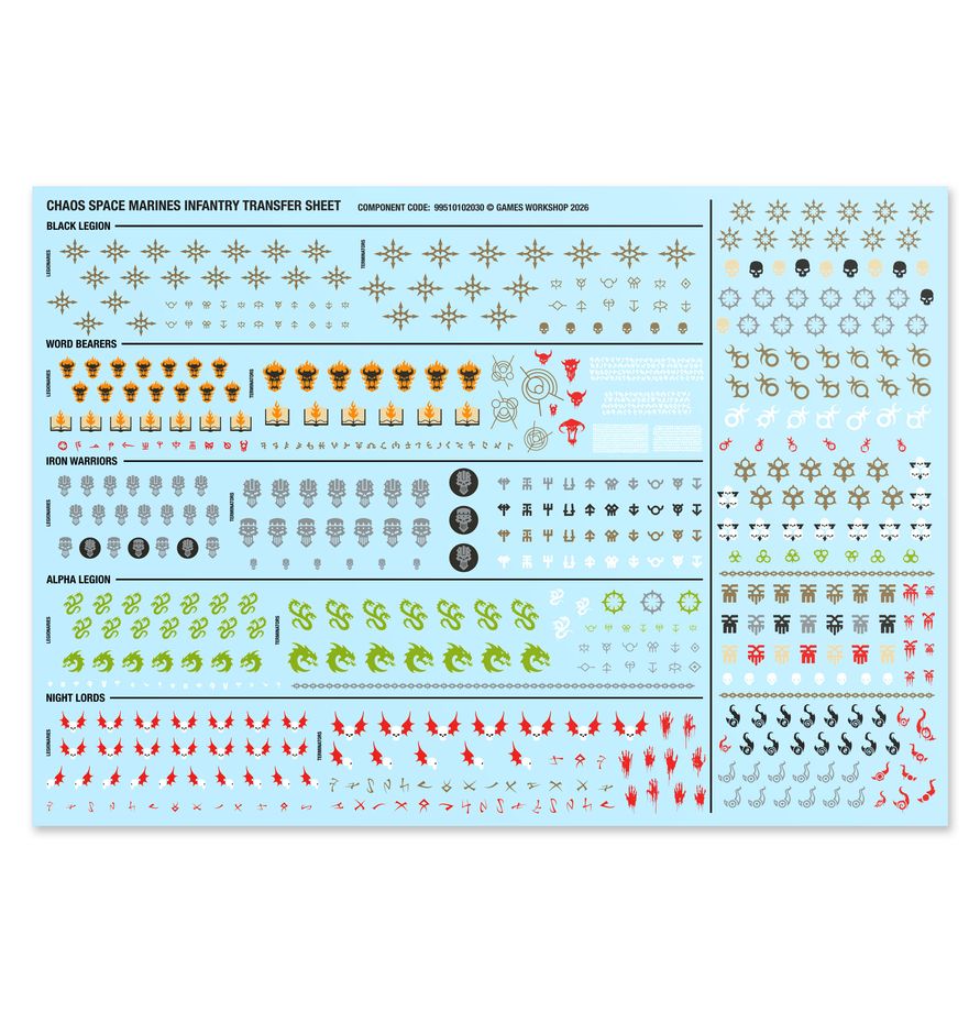 Ogni foglio di trasferibili della fanteria degli Space Marines del Caos contiene 569 decalcomanie ad acqua di alta qualità, tra cui icone per Black Legion, Word Bearers, Alpha Legion, Night Lords e Iron Warriors, nonché altri simboli del Caos, da usare per decorare i tuoi modelli.