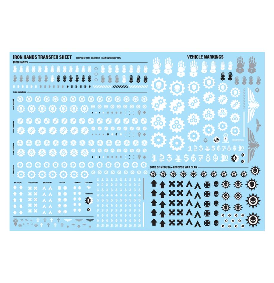 Il kit è formato da 320 componenti di plastica e viene fornito con 2x basette Citadel rotonde da 80mm con fori, 11x basette Citadel rotonde da 40mm e 1x foglio di trasferibili degli Iron Hands, contenente 468 decalcomanie ad acqua di alta qualità. Le miniature devono essere assemblate e dipinte