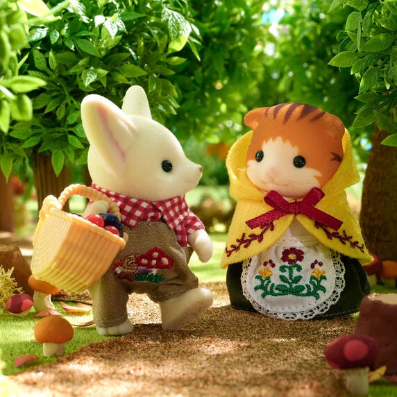 Benjamin's overalls are embroidered with mushrooms, and Milly's cape and apron are embroidered with flowers, perfect for a walk in the forest.